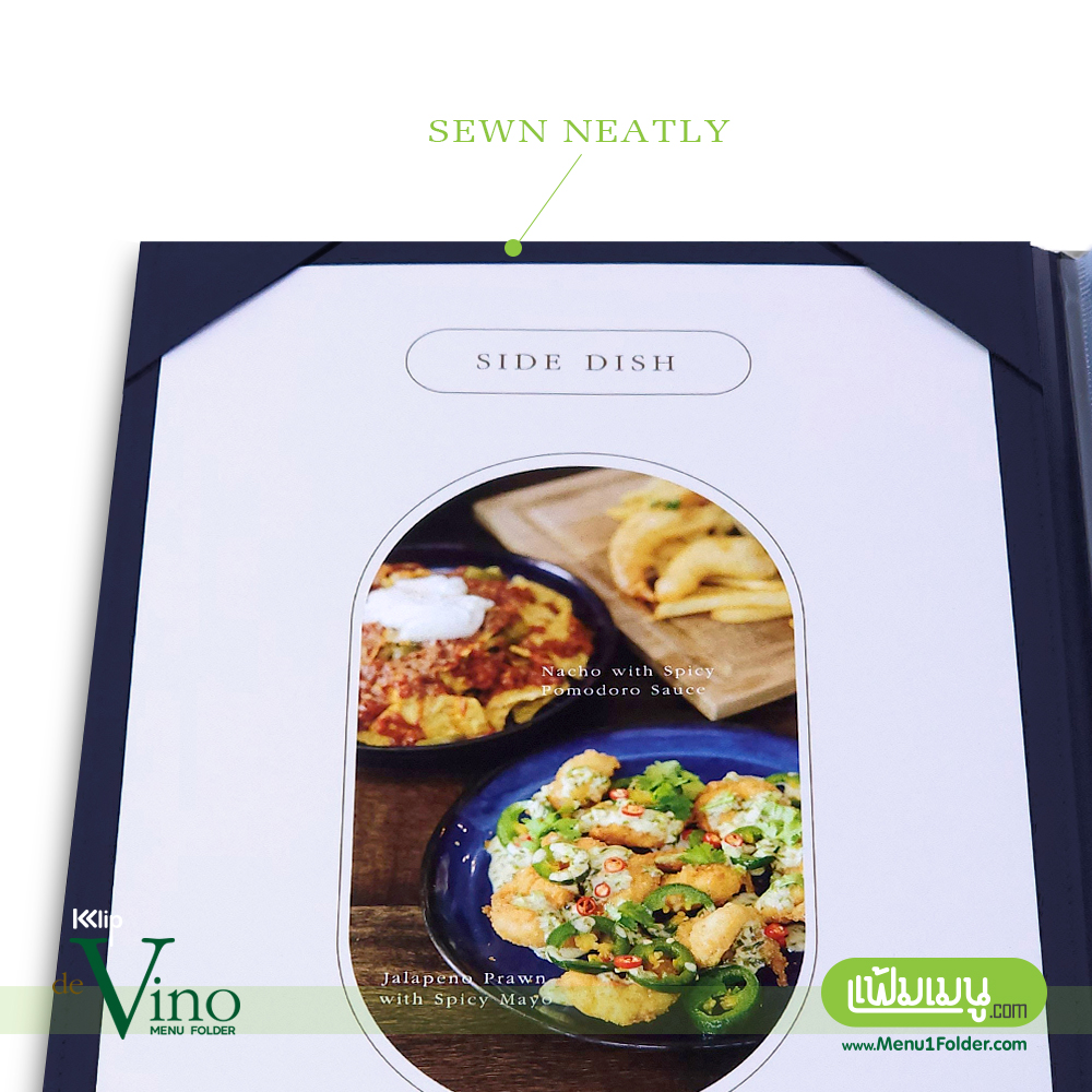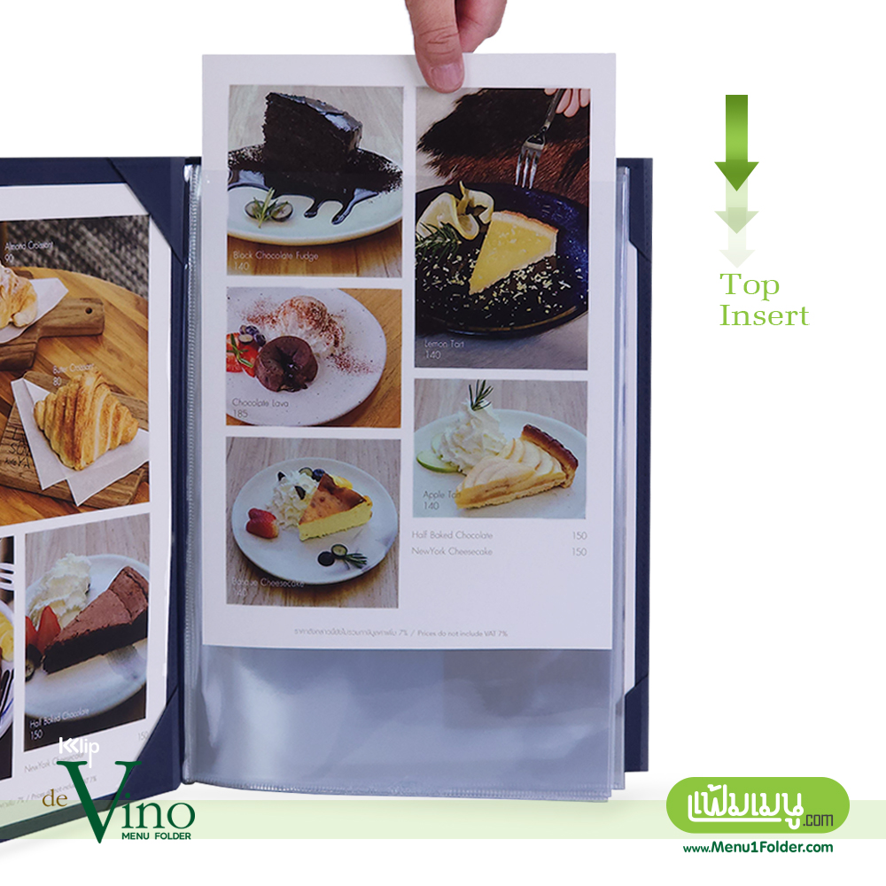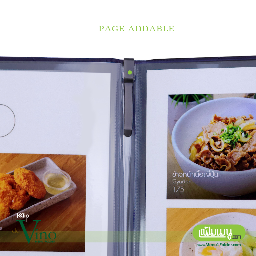 Menu Klip & Super Clear PVC: The menu folder has a secure metal clip and allows you to add or remove menu pages yourself. A4 size menu sheets are sold exclusively at แฟ้มเมนู.com. They are made of clear PVC, displaying vibrant and sharp colors that are appetizing. Starting at 1 folder, it includes 3 pairs of folders = 12 pages + 2 front and back corner insert covers. You can add more pages and folders up to 48 pages, plus 2 more on the back covers, for a larger menu.