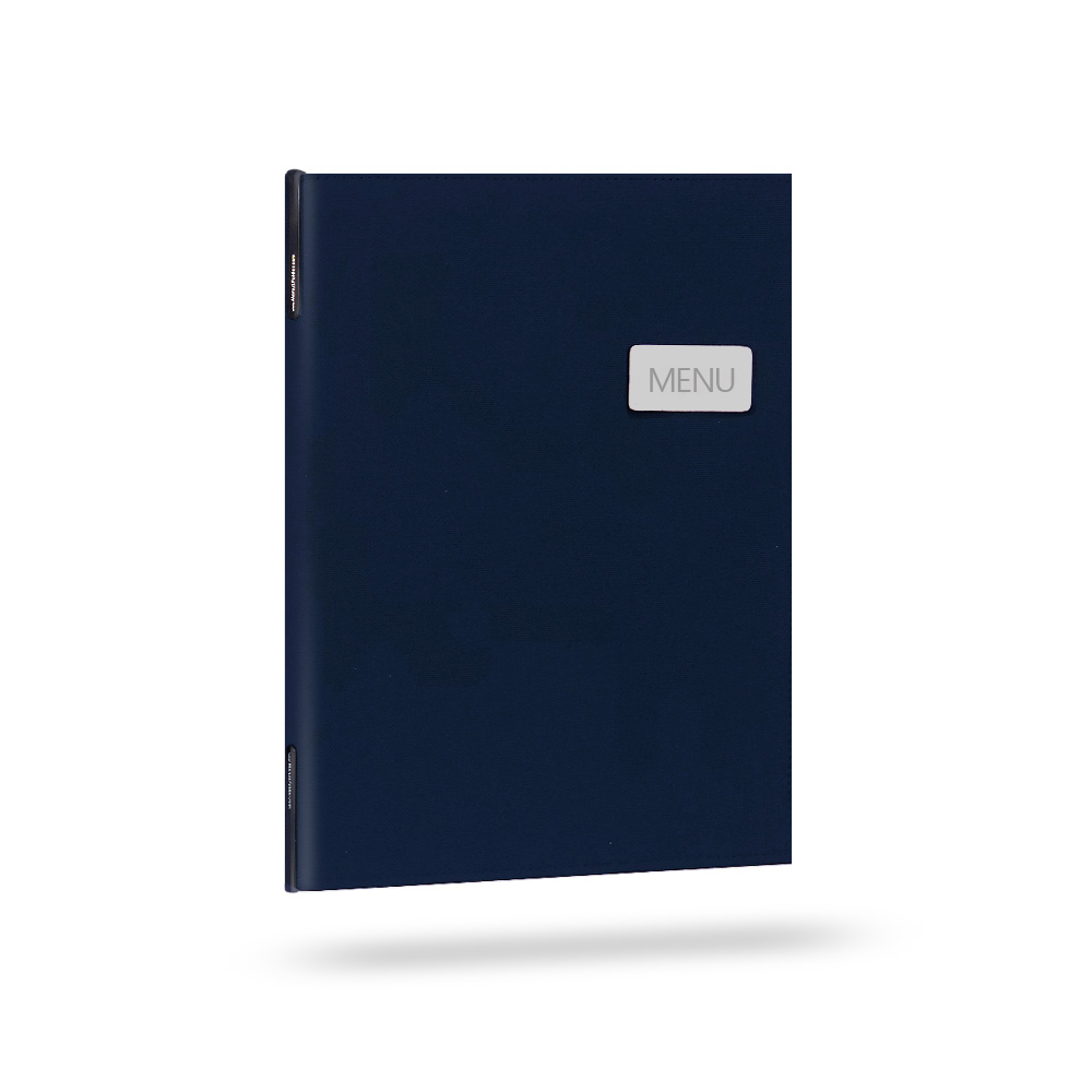 Linen Leather Navy Blue Menu Book: แฟ้มเมนูปกหนังสีน้ำเงิน ให้ความรู้สึกทันสมัย ช่วยเสริมสร้างบรรยากาศร้านให้ดูมีระดับ เหมาะกับร้านอาหาร คาเฟ่ สไตล์ยุโรป สมัยใหม่ ที่ต้องการภาพลักษณ์ที่แตกต่างจากแฟ้มเมนูสีพื้นๆทั่วไป