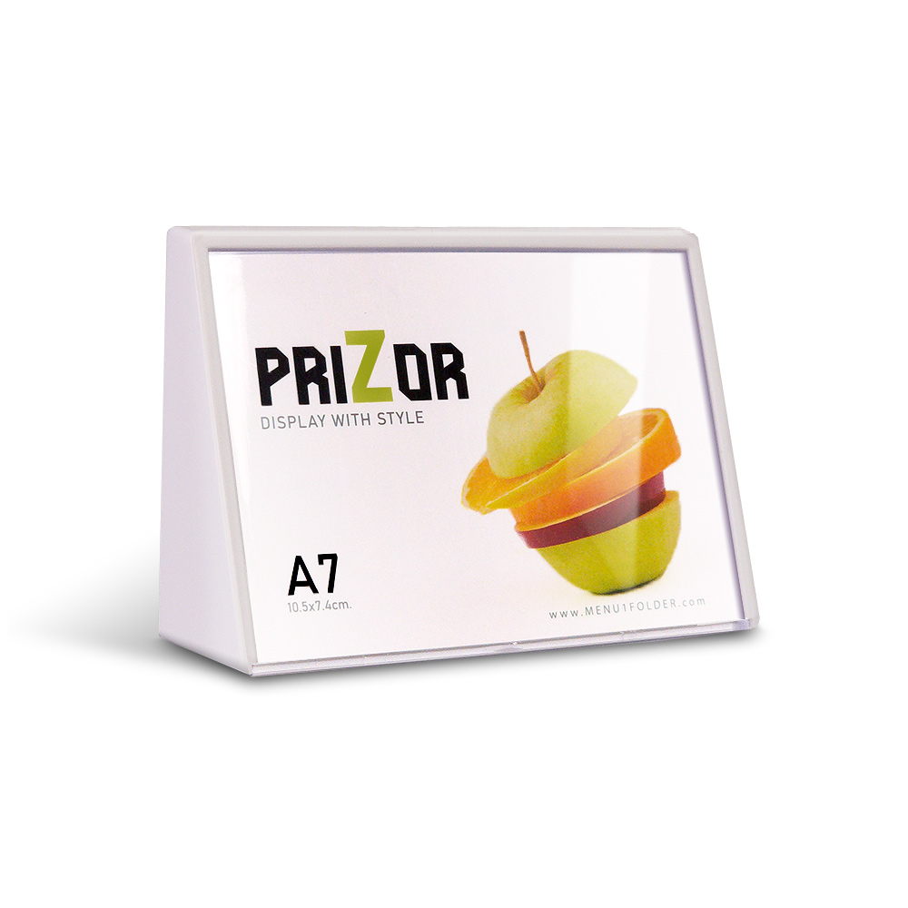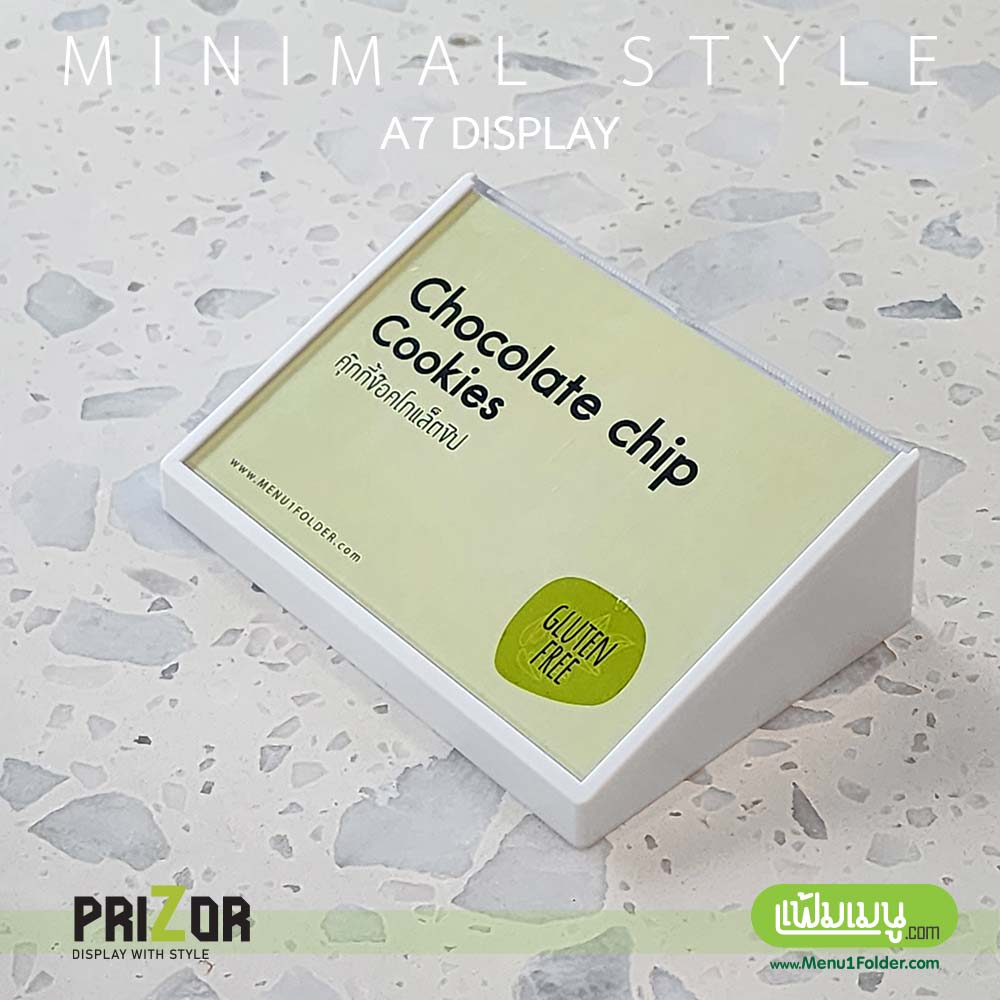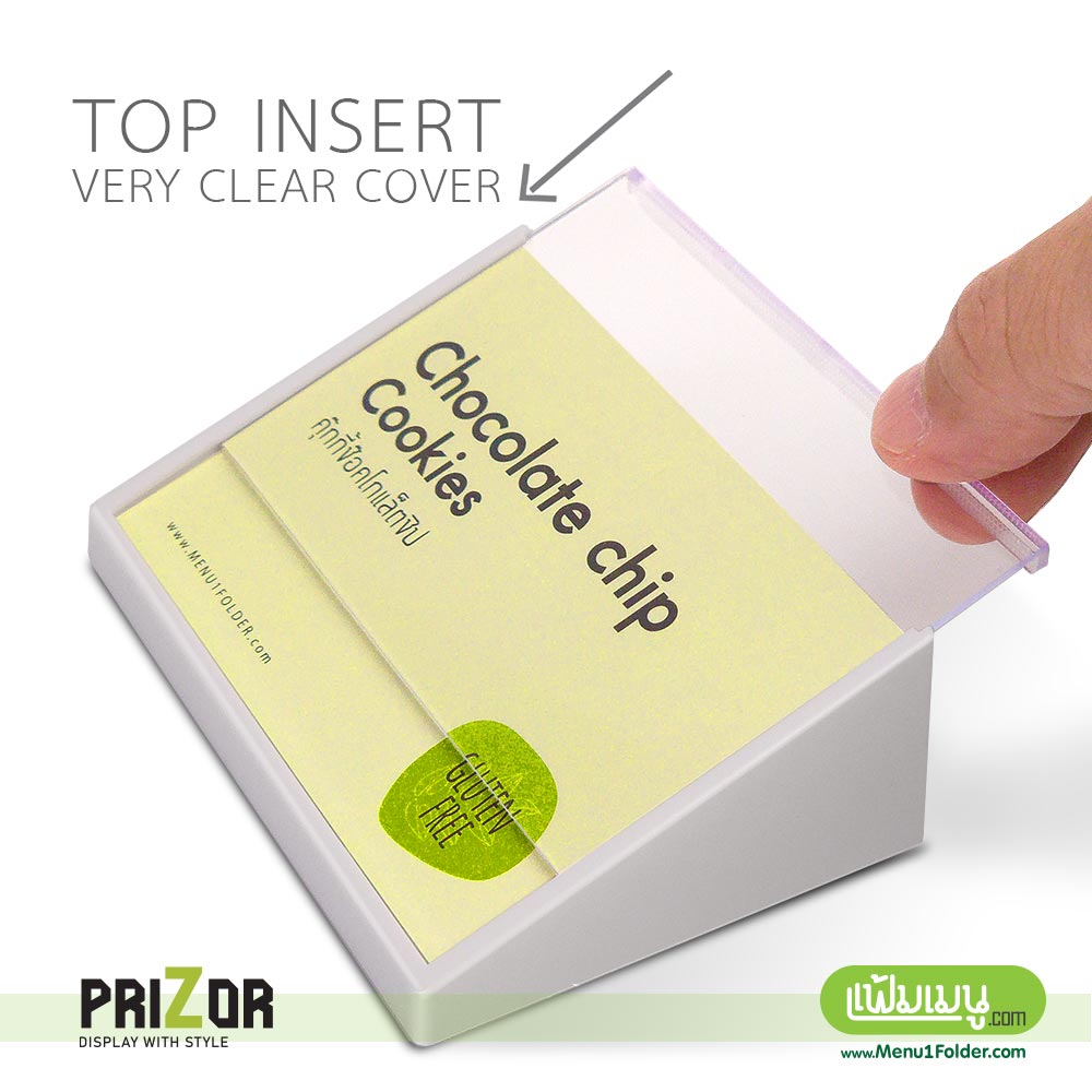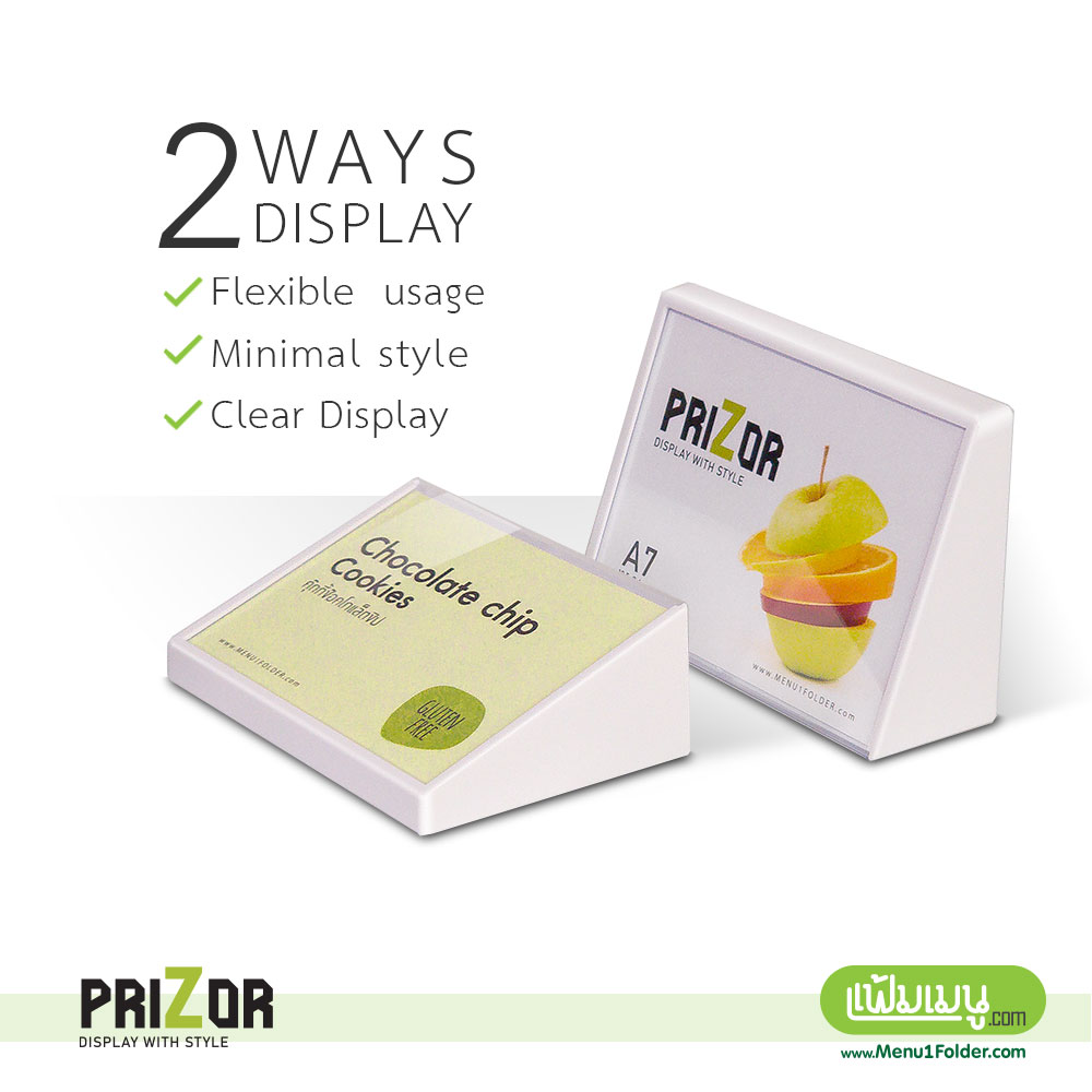 ป้ายตั้งโต๊ะ รุ่น Prizer A7 สีขาว ออกแบบแนวมินิมอล เรียบง่าย มีสไตล์ องศาเอียงกำลังดี ทำให้เห็นป้ายชัดเจน สวยงาม ใช้เป็น ป้ายชื่ออาหาร ใน line บุปเฟต์, ป้ายชื่อสินค้า ป้ายราคา บนชั้นวางสินค้า ในร้านค้าปลีก ร้านแฟนชั่น ได้อย่างดี มีสไตล์