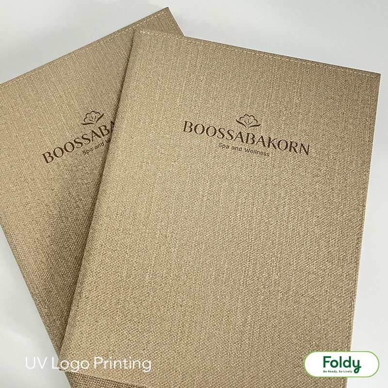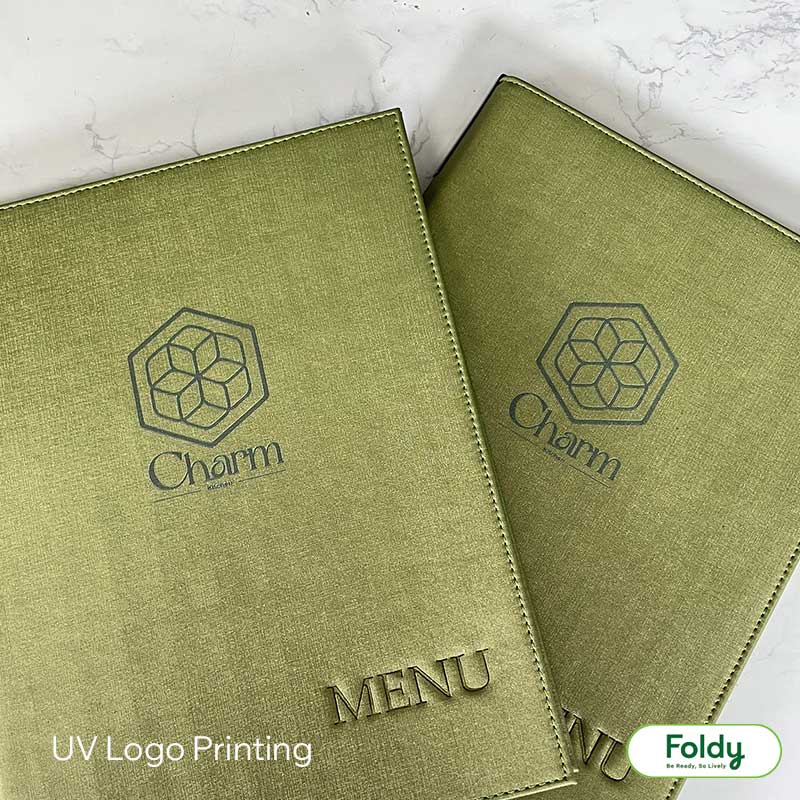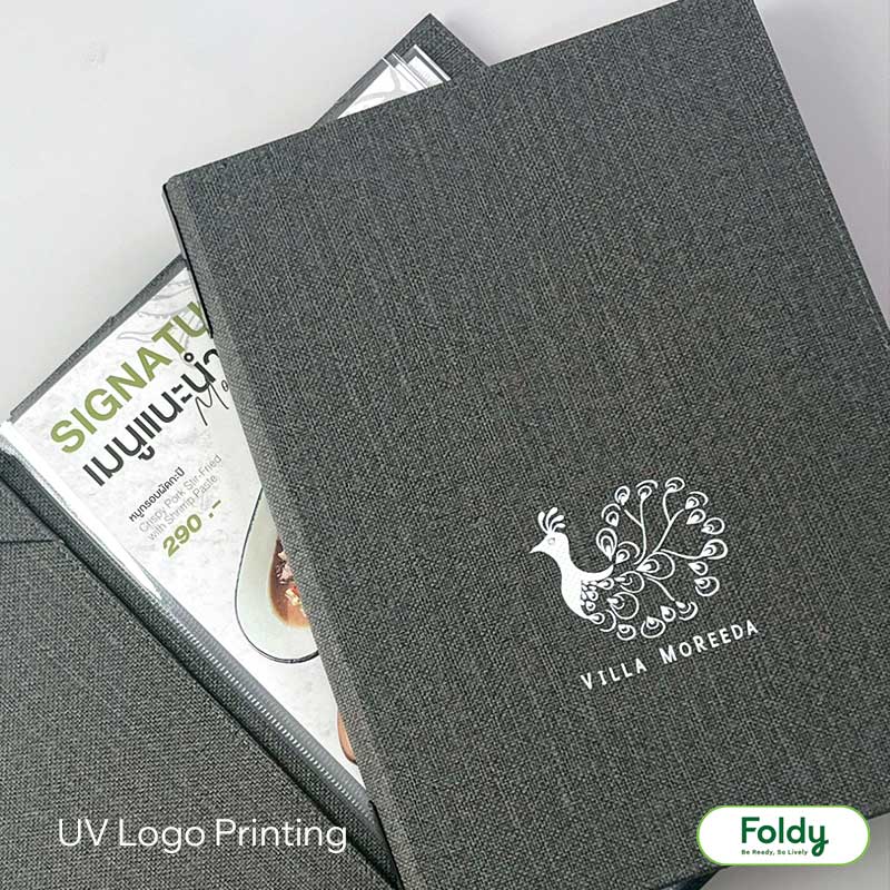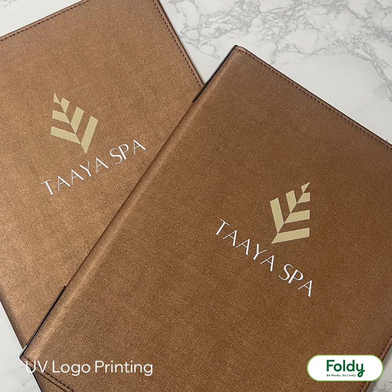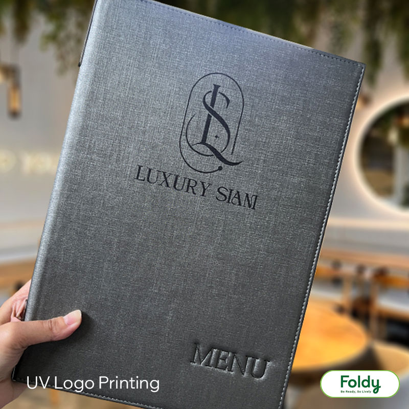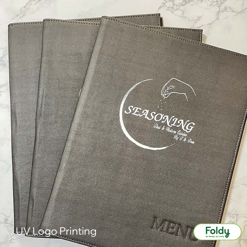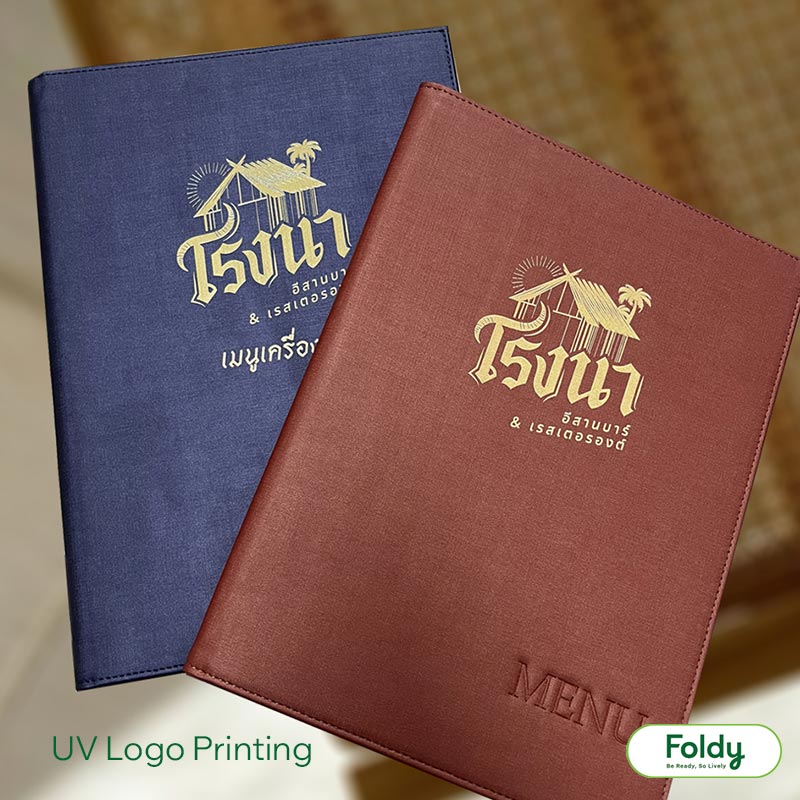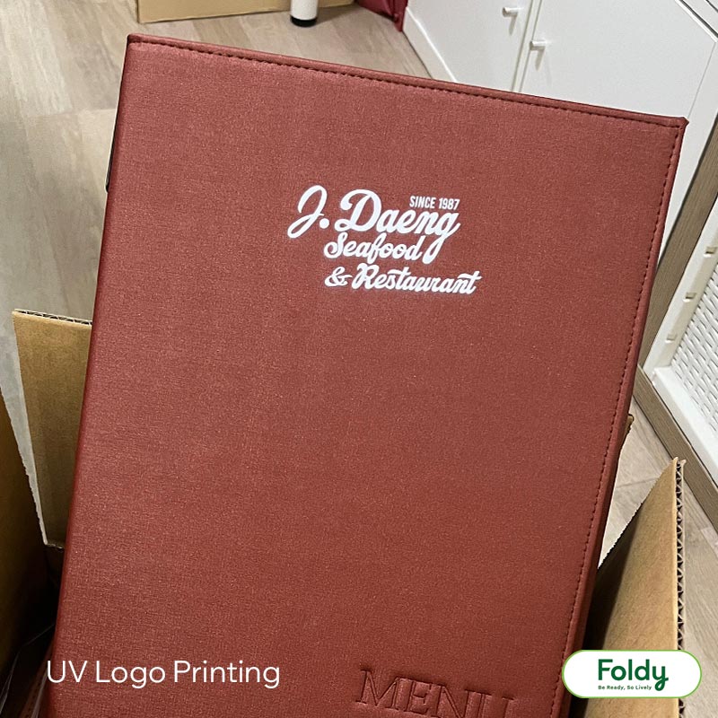 Portfilo Logo UV printing โลโก้ปกแฟ้มเมนู ตัวอย่างผลงาน พิมพ์โลโก้บนปกแฟ้มเมนูอาหาร ที่ผ่านมา สนใจ Logo UV print บนแฟ้มเมนู "ปั๊มจมโลโก้" vs "พิมพ์ UV โลโก้"